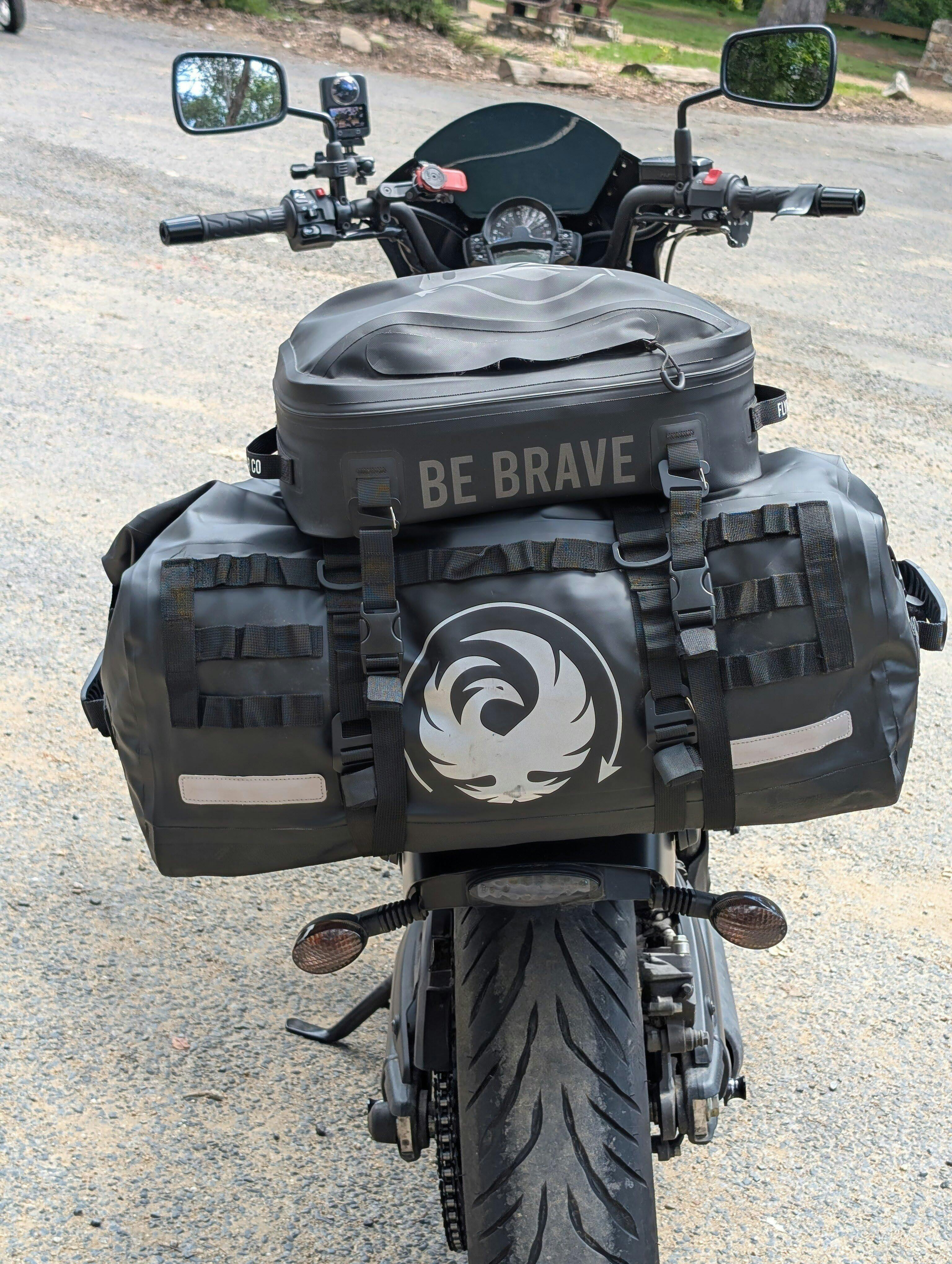 Roxby fits heaps and I love how you can sinch it down tight and get rid of the air via the valve. Have it strapped onto my Kawasaki Vulcan via a luggage rack. This is its second trip now. The only thing I didn't like was it's bottom wasn't rigid enough and it bent around my luggage rack when strapped down on my previous trip. This trip I cut corflute to size and placed it as a base inside the bag and it holds the bag bottom taught with no bending around or slippage on my luggage rack. My medium Tully bag is piggybacked to top, super easy set up to grab things quickly.